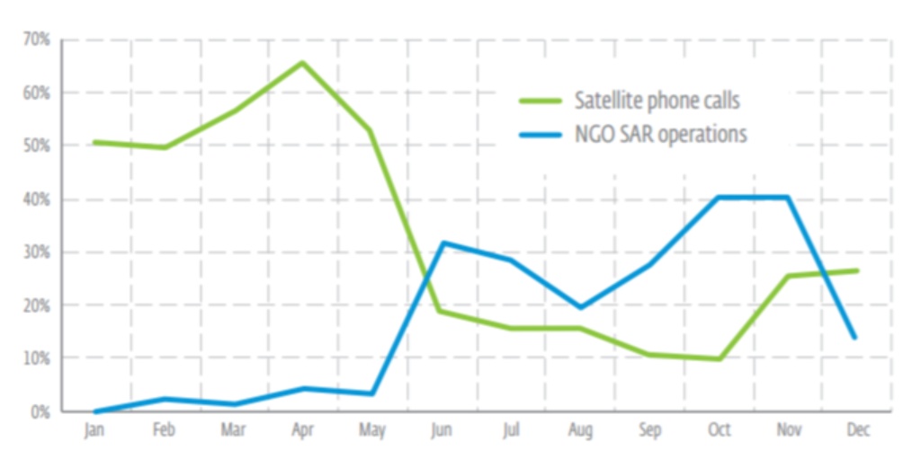 Nel rapporto, Frontex spiega che le modalità di soccorso dei migranti sono cambiate molto nel corso del 2016. Fino a maggio 2016 gran parte delle operazioni di salvataggio iniziava in seguito a richieste di soccorso che provenivano dagli stessi barconi di migranti, i quali si mettevano in comunicazione con il centro di soccorso di Roma e chiedevano aiuto, spesso mentre si trovavano già in alto mare. In queste circostanze, le imbarcazioni delle ong prestavano assistenza in circa il 5 per cento degli incidenti. A partire dall’estate le chiamate sono diminuite molto e una grossa fetta delle operazioni ha iniziato a essere svolta da imbarcazioni di ong che operano a ridosso delle acque territoriali libiche. Nella seconda parte del 2016, secondo Frontex, le ong hanno partecipato al 40 per cento dei salvataggi.