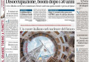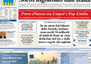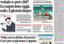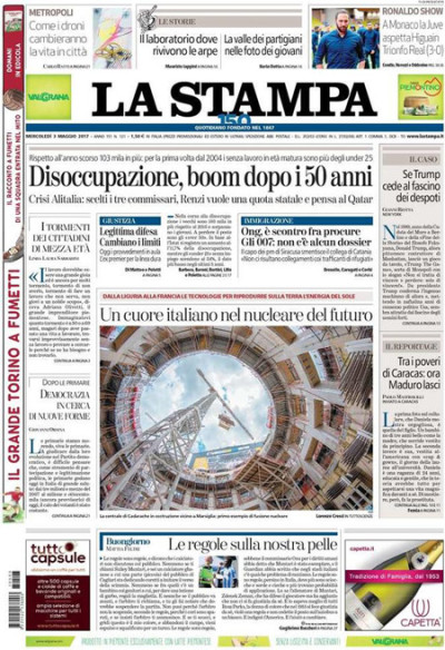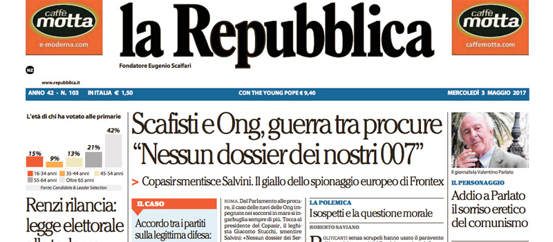 I giornali di oggi dedicano l’apertura a notizie diverse: alcuni si occupano della vicenda Alitalia, con la nomina da parte del governo di tre commissari per gestire la compagnia e la concessione di un prestito ponte di 600 milioni di euro, altri dei rapporti fra organizzazioni non governative e trafficanti di migranti, sui quali ieri il procuratore di Siracusa e il presidente del Copasir hanno detto di non avere nessuna prova, altri ancora commentano i risultati delle primarie del Partito Democratico di domenica. Il Manifesto dedica la prima pagina al ricordo di Valentino Parlato, ex direttore del giornale, la Stampa, il Mattino e il Secolo XIX titolano sui nuovi dati sulla disoccupazione diffusi dall’ISTAT, e i quotidiani sportivi presentano la partita di stasera fra Monaco e Juventus per l’andata delle semifinali di Champions League.