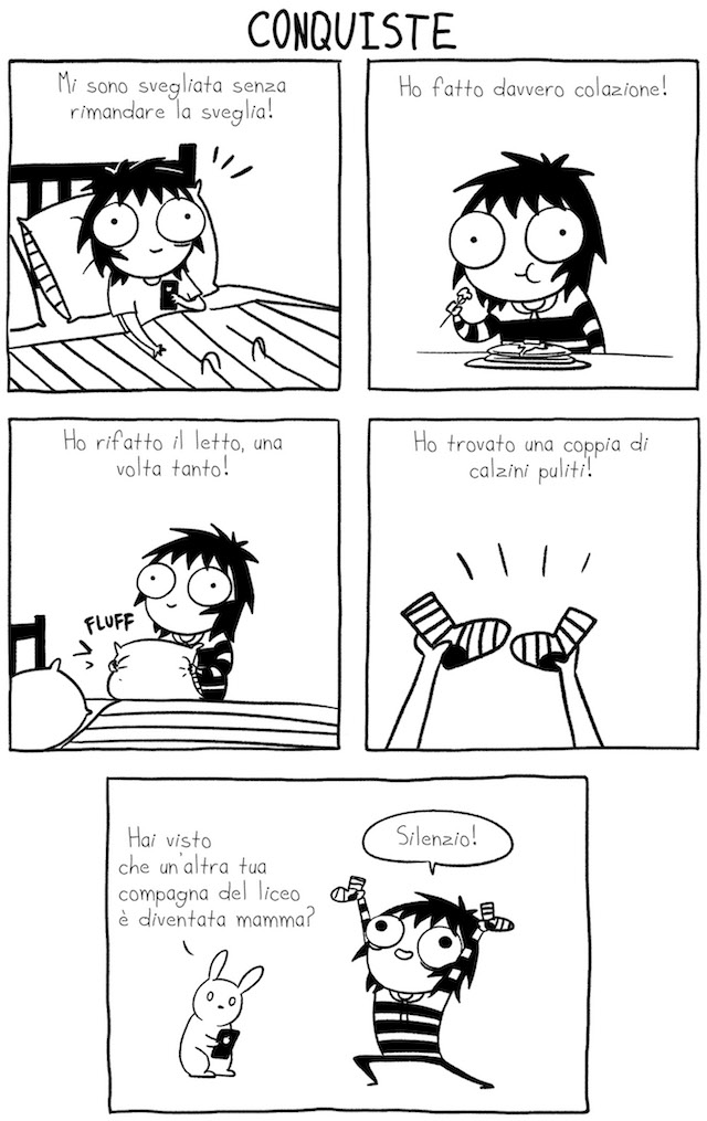 Probabilmente molte di loro si identificano nella versione disegnata di Andersen, un personaggio senza nome che come lei fa la disegnatrice e ha a che fare con i problemi – problemi da primo mondo, li chiamiamo – di molte persone tra i venti e i trent’anni, come rispettare le scadenze, gestire l’ansia, smettere di ritardare la sveglia, accettare il proprio aspetto fisico e riuscire a parlare con una persona attraente a una festa. Oltre alla protagonista ci sono varie amiche e fidanzati, gatti, e alcuni personaggi che rappresentano tratti della protagonista con cui lei si trova a parlare: un coniglietto, che è una specie di grillo parlante (non troppo diverso dall’armadillo di Zerocalcare), e il suo stesso cervello e il suo utero, che intervengono a complicarle la vita, ad esempio dimenticandosi le cose importanti oppure provocando il suo cattivo umore. Il titolo originale della prima raccolta delle strisce era Adulthood Is a Myth, cioè “L’età adulta è un mito”.