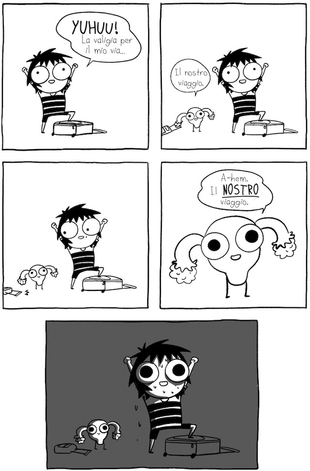 Sarah Andersen sembra timida, o comunque intimidita dal parlare in pubblico. Non è una novità per chi segue le sue strisce: ce n’è una in cui piuttosto che parlare in pubblico il suo personaggio decide di buttarsi su un mucchio di serpenti. Durante tutta la fiera Andersen ha passato tanto tempo allo stand di BeccoGiallo a firmare copie del suo libro. Il giorno dopo la presentazione niente più vestito con fiori ricamati: indossa una felpa molto larga, un modello maschile, di quelle tanto amate – e rubate ai fidanzati – dalla protagonista di Sarah’s Scribbles. Chissà se col tempo, col “diventare grande” della sua autrice, la protagonista delle strisce cambierà: Andersen spiega che è una domanda che le viene fatta spesso e che non ha una risposta definitiva, anche se pensa che il carattere non cambierà e che per lei le strisce non parlano soprattutto del “diventare grandi”. Sono un modo per esprimere una serie di sentimenti e modi di essere, spesso di quelli che ci sembrano solo nostri e di cui non andiamo fieri.