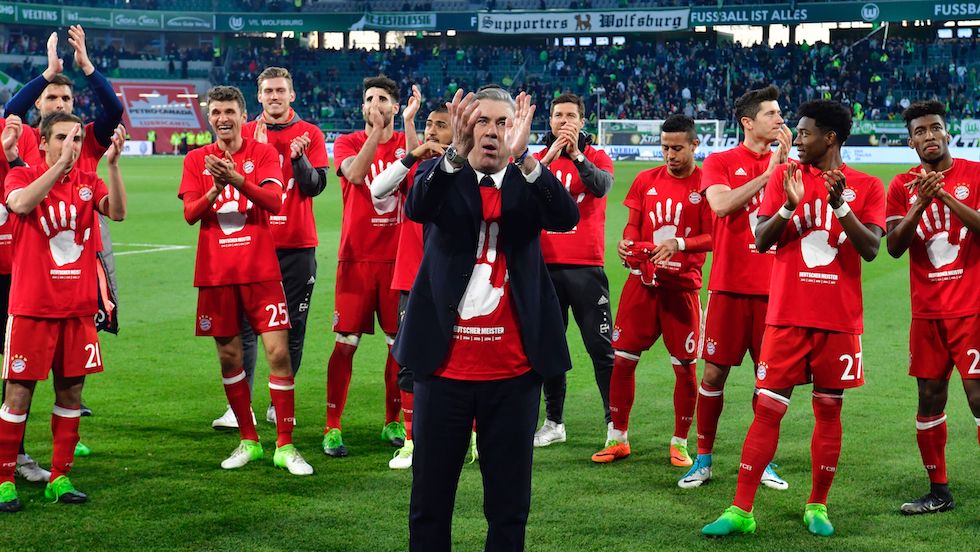 Carlo Ancelotti festeggia con la squadra del Bayern la vittoria della Bundesliga (JOHN MACDOUGALL/AFP/Getty Images)