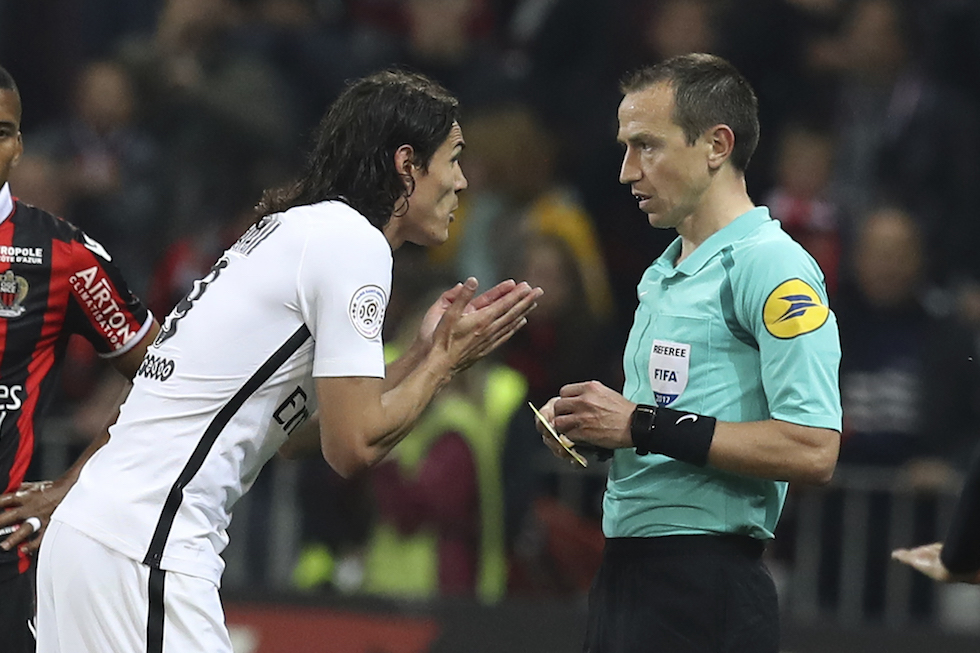 Edinson Cavani protesta contro l’arbitro durante Nizza-PSG (VALERY HACHE/AFP/Getty Images)