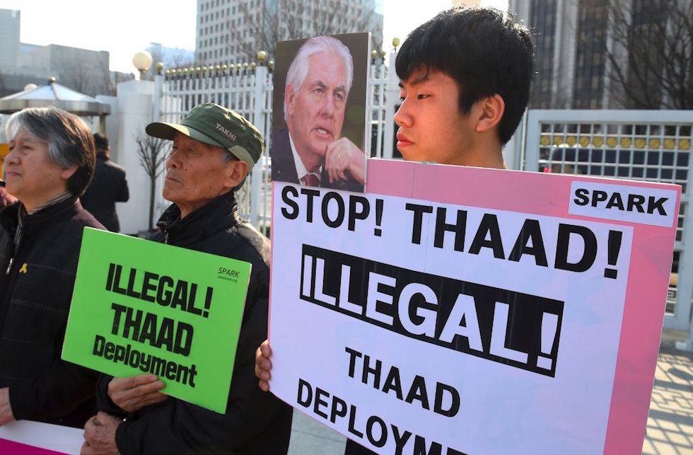 Una manifestazione contro il THAAD durante una recente visita in Corea del Sud del segretario di stato americano Rex Tillerson (JUNG YEON-JE/AFP/Getty Images)