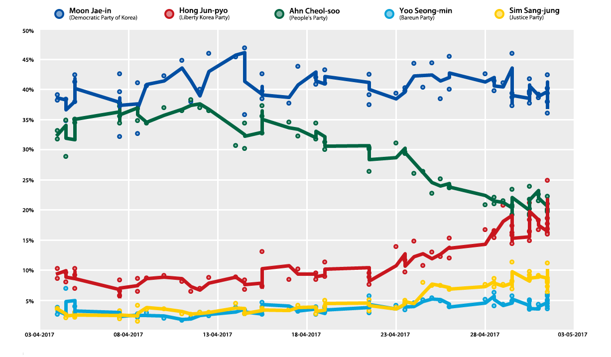 Secondo diversi osservatori internazionali, Moon è nettamente favorito e a meno di sorprese dovrebbe vincere le elezioni di oggi: il più recente sondaggio dell’istituto Gallup lo dà intorno al 38 per cento dei consensi. Hong è considerato in rimonta anche dai sondaggi, e sembra aver superato il centrista Ahn Cheol-soo. Molto più in basso nelle considerazioni degli analisti e nei sondaggi sono la candidata di sinistra Shim Sang-jung e quello di destra Yoo Seung-min.
