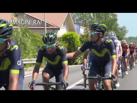 Quintana, il più forte di tutti in salita, ha chiesto alla Movistar, la sua squadra, di mettersi a tirare in testa al gruppo, per alzare il ritmo e far stancare il prima e il più possibile tutti gli altri. È successo però che a far staccare alcuni corridori – compresi alcuni di quelli che puntavano alla maglia rosa, o comunque a un podio finale – sia stato un incidente. Una moto della polizia – una delle molte che precedono, accompagnano o seguono i ciclisti per garantire la sicurezza lungo il percorso – che si trovava davanti al gruppo principale ha accostato e si è fermata in modo piuttosto brusco sul lato sinistro della strada. Alcuni ciclisti l’hanno vista ed evitata, uno di loro l’ha toccata, è caduto e ha di conseguenza fatto cadere alcuni ciclisti che lo seguivano. Tra loro c’erano Adam Yates, un giovane e promettente britannico, e Geraint Thomas e Mikel Landa, i due capitani del Team Sky. Hanno perso tempo per la caduta e hanno dovuto fare la salita feriti o comunque acciaccati, arrivando con molto ritardo e compromettendo le loro possibilità di vincere il Giro. Yates e Thomas sono arrivati al traguardo circa cinque minuti dopo Quintana; Landa, quello che si è fatto più male, è arrivato con 27 minuti di ritardo.