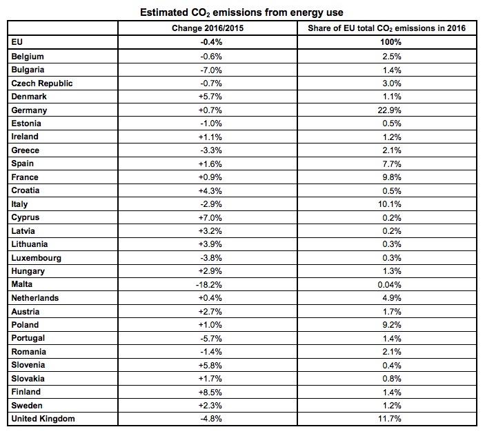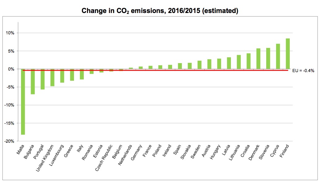 I paesi che hanno fatto registrare la maggiore riduzione nelle emissioni di anidride carbonica sono stati Malta, Bulgaria, Portogallo e Regno Unito. Buoni risultati sono stati raggiunti anche da Grecia e Romania, oltre che dall’Italia. Diversi altri stati tra il 2015 e il 2016 hanno invece aumentato le loro emissioni, prima fra tutti la Finlandia con 8,5 per cento in più, seguita da Cipro con il 7 per cento.