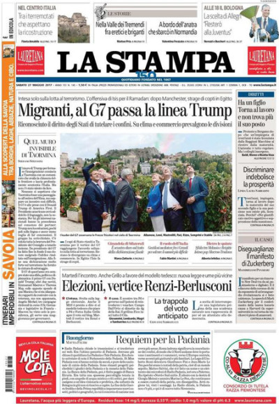 La notizia principale in apertura sulla maggior parte dei giornali di oggi è l’inizio del vertice dei G7 a Taormina, durante il quale è stata raggiunta un’intesa sulla lotta al terrorismo mentre su clima, migranti e commercio rimangono idee differenti fra i vari paesi. Altri giornali aprono sull’attacco in Egitto a un pullman di cristiani copti, che ha provocato almeno 28 morti, mentre l’Unità e il Fatto titolano sulla legge elettorale e sull’ipotesi di accordo fra Partito Democratico, Forza Italia e Movimento 5 Stelle su una legge che segua il modello tedesco.