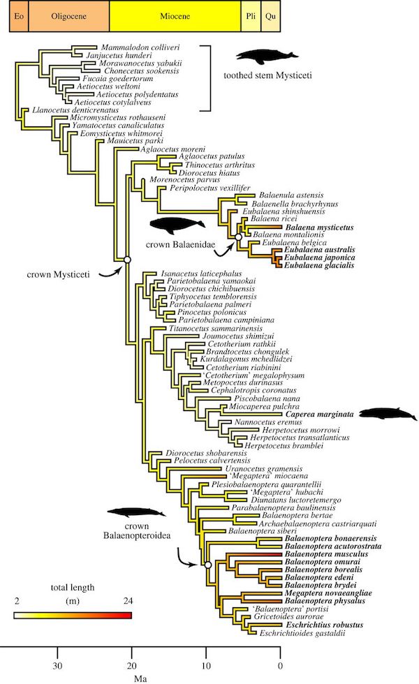 Per determinare quale fosse la spiegazione più convincente, Jeremy Goldbogen dell’Università di Stanford, Graham Slater dell’Università di Chicago e Nick Pyenson dello Smithsonian Institution hanno raccolto dati sulle dimensioni delle balene attuali e sui fossili delle specie estinte e li hanno organizzati per specie e in ordine cronologico. Hanno scoperto che le balene davvero grandi, quelle più lunghe di 10 metri, ci sono da relativamente poco tempo: da 4,5 milioni di anni, che sono pochi considerando che le prime balene sono comparse circa 35 milioni di anni fa.