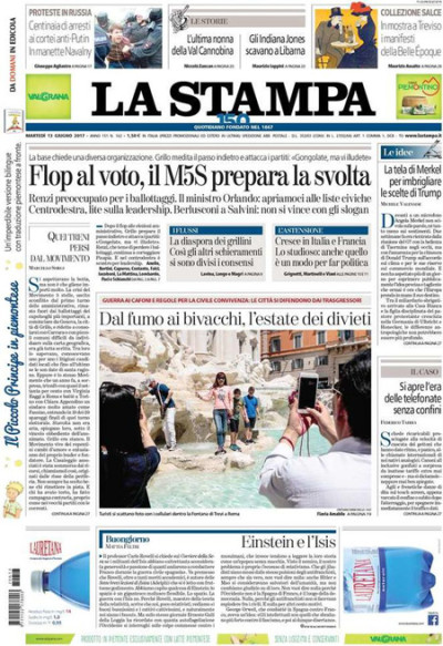 Tutti i giornali di oggi si soffermano ad analizzare i risultati del primo turno delle elezioni amministrative di domenica, e gli aspetti principali sui quali si concentrano i titoli sono l’insuccesso del Movimento 5 Stelle, escluso da tutti i ballottaggi nei comuni più grandi, e la reazione di Beppe Grillo ai dati elettorali, il rilancio dell’alleanza di centrodestra, che ha ottenuto risultati superiori alle attese, e in prospettiva il possibile ritorno a due poli di centrodestra e centrosinistra per le elezioni politiche.