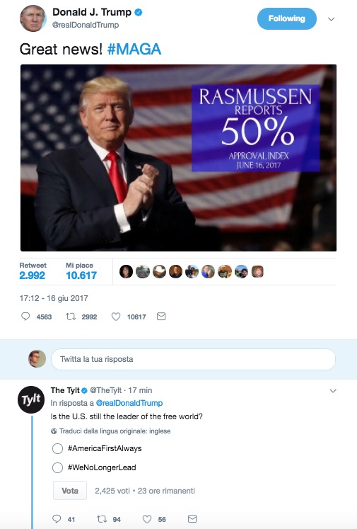 The Tylt, un giornale online, ha iniziato a sfruttare le fulminee risposte ai tweet di Trump per mettere in evidenza i suoi contenuti, rinviando con link agli articoli pubblicati sul suo sito. L’account di The Tylt utilizza anche il sistema dei sondaggi di Twitter per coinvolgere gli altri utenti e invitarli a votare su vari temi, di solito legati agli argomenti sollevati da Trump con i suoi messaggi.
