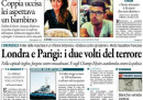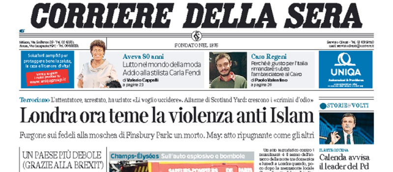 I due attentati di ieri a Londra, dove un uomo alla guida di un furgone ha investito le persone che uscivano da una moschea uccidendone una e ferendone nove, e a Parigi, dove un’auto si è schiantata contro una camionetta della polizia sugli Champs-Élysées esplodendo e provocando la morte del guidatore, sono in apertura sulla maggior parte dei quotidiani di oggi. La Stampa titola invece sulle tensioni fra Russia e Stati Uniti in Siria dopo l’abbattimento di un aereo militare siriano impegnato in un’azione contro i curdi siriani vicino a Raqqa, mentre il Giornale e il Dubbio si occupano della legge sulla cittadinanza e dell’annuncio del ministro Alfano di voler votare a favore del provvedimento.