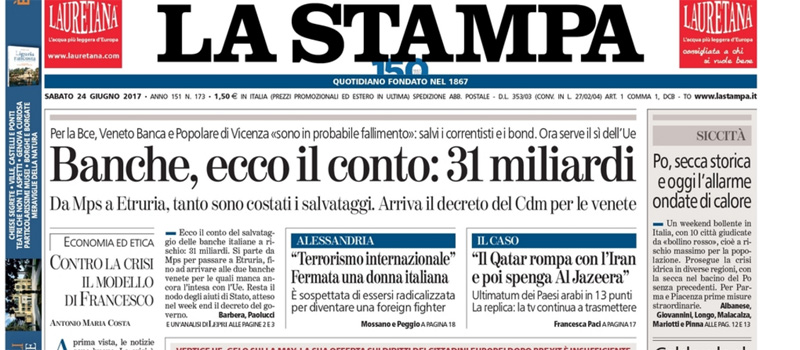 La notizia in apertura sui principali quotidiani di oggi è il salvataggio delle banche venete in crisi delle quali, dopo l’offerta per rilevarle presentata da Banca Intesa, dovrebbe occuparsi oggi il Consiglio dei Ministri con l’approvazione del decreto relativo, in attesa poi dell’assenso da parte dell’Unione Europea. Il Manifesto, il Fatto e il Dubbio ricordano Stefano Rodotà, il giurista morto ieri a 84 anni, mentre il Giornale titola sul nuovo contratto di Fabio Fazio con la RAI, criticandolo per il compenso eccessivo.