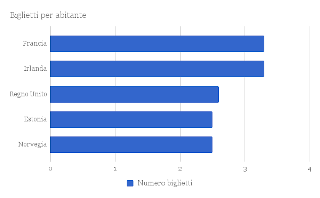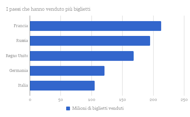 Il paese che ha venduto più biglietti è la Francia (213 milioni), seguita da Russia, Regno Unito, Germania e Italia (105 milioni). Rispetto al 2015, i biglietti venduti in Francia sono aumentati del 3,8 per cento; quelli venduti in Italia sono aumentati del 6,1 per cento. Il costo medio di un biglietto nei 36 paesi UNIC è 6,6 euro. La classifica degli incassi totali di ogni paese è invece un’altra cosa: non tutti i paesi hanno l’euro e i biglietti hanno prezzi diversi.