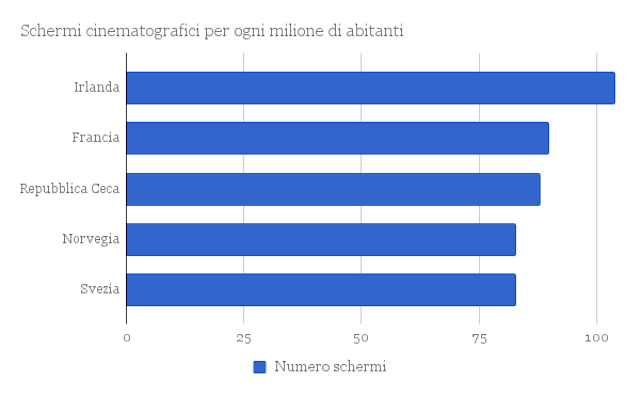 La media dei paesi UNIC è di 52 schermi per ogni milione di abitanti. Il paese in cui questo numero è più alto è l’Irlanda (104); seguono Francia, Repubblica Ceca, Norvegia e Svezia. In Italia ci sono 65 schermi per ogni milione di abitanti. Il paese in cui il numero è più basso è la Bosnia-Erzegovina: 9.