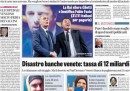 Le prime pagine di oggi parlano soprattutto di tre cose: delle alte temperature registrate un po’ in tutta Italia, ma soprattutto al Nord, del ballottaggio delle elezioni amministrative, e del cosiddetto “salvataggio” di alcune banche venete. I giornali sportivi si interessano soprattutto di calciomercato e della vittoria di ieri della Nazionale Under 21 di calcio agli Europei, dove si è qualificata per la semifinale.