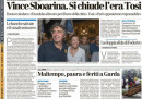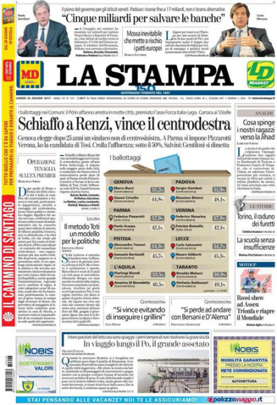 Tutti i giornali di oggi aprono sui risultati dei ballottaggi delle elezioni amministrative di ieri, sottolineando la vittoria del centrodestra, che vince in città importanti come Genova, Verona e L’Aquila, e la sconfitta di Renzi e del Partito Democratico, che vince a Padova e a Lecce fra i capoluoghi di provincia. Il poco spazio rimasto sulle prime pagine è dedicato all’approvazione da parte del Consiglio dei ministri del decreto per il salvataggio delle banche venete in crisi con la vendita a Banca Intesa, e alle notizie sportive, con la vittoria di Valentino Rossi in MotoGP, gli scontri fra Hamilton e Vettel in Formula 1 e ancora il futuro del portiere del Milan Donnarumma.