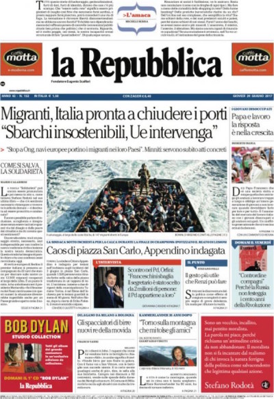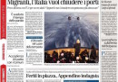 Sui giornali italiani di oggi si parla molto della dura posizione presa dal governo sull’accoglienza dei migranti: ha minacciato di impedire nuovi sbarchi di migranti in Italia se l’Europa non accetterà di farsi carico di una parte di essi. Si parla anche dell’indagine sulla sindaca di Torino Chiara Appendino per i fatti di piazza San Carlo e c’è ancora spazio per le tensioni dentro al Partito Democratico iniziate dopo il brutto risultato alle amministrative di domenica scorsa.
