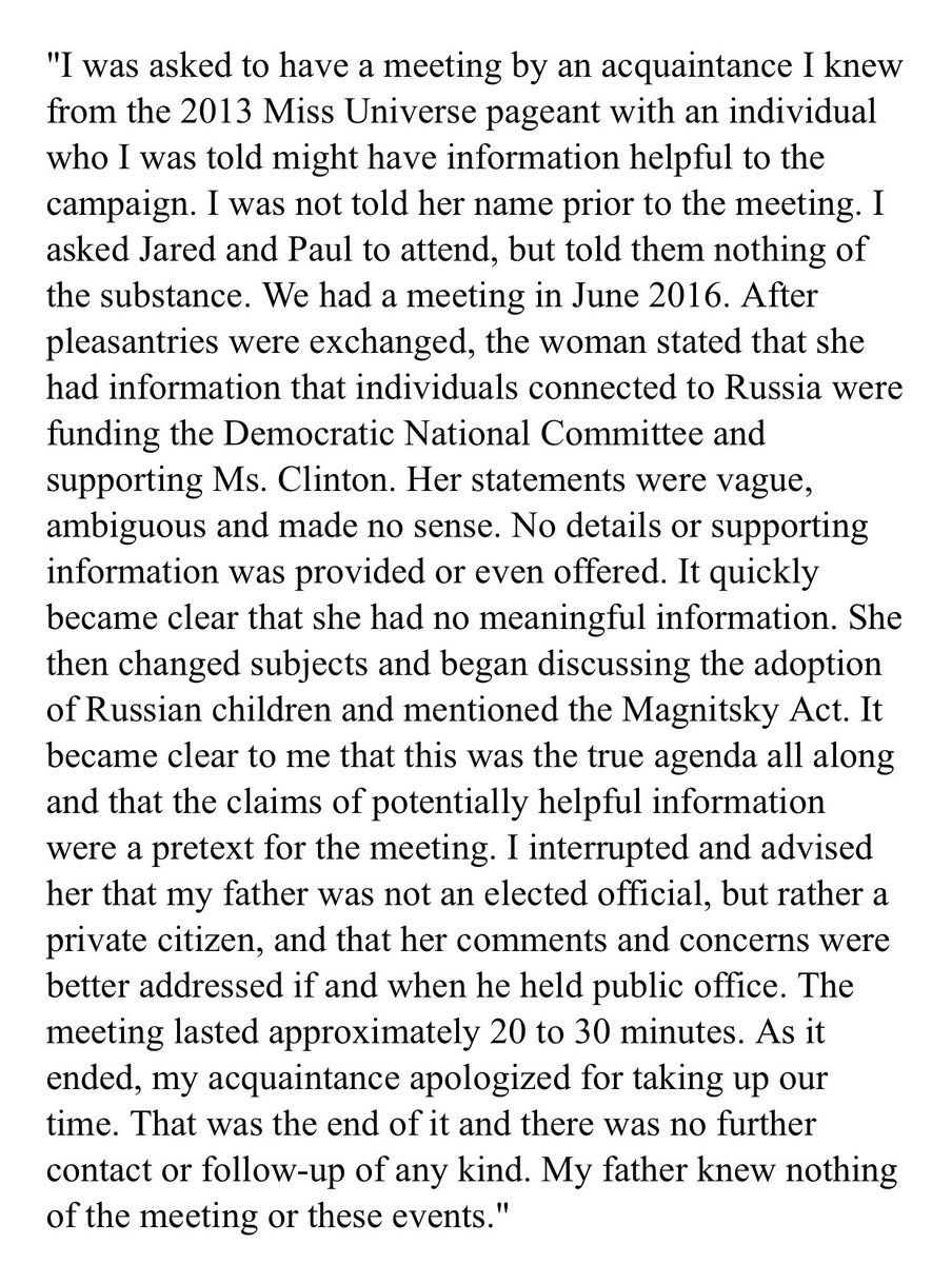 Soltanto quando il New York Times ha diffuso i dettagli sul contenuto dell’incontro (scrivendo quindi che Veselnitskaya propose materiale compromettente su Clinton), Trump Jr ha diffuso questo comunicato contraddicendosi di nuovo.