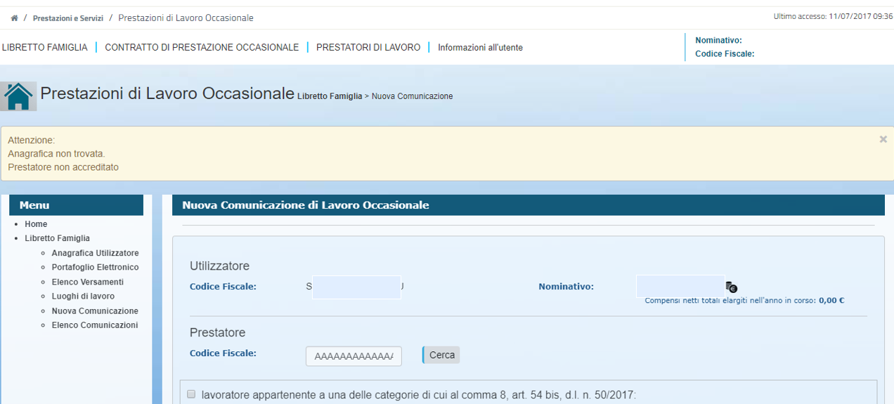 Una volta riempito il “Portafoglio elettronico”, si può procedere alla comunicazione di prestazione: il momento in cui avvertiamo l’INPS che una persona si impegnerà in un lavoro occasionale per noi. Nella pagina qui sotto bisogna inserire il nome e codice fiscale dell’utilizzatore, cioè il datore di lavoro, e del prestatore, cioè il lavoratore, la tipologia di impiego e l’importo corrisposto.