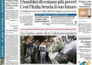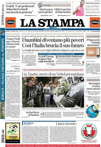 Ci sono molte notizie diverse in apertura sui principali quotidiani di oggi: alcuni titolano sui dati diffusi dall’ISTAT sulla povertà in Italia, il Corriere della Sera segue l’incontro di Parigi fra il presidente francese Macron e quello degli Stati Uniti Trump, il Giornale pubblica le foto scattate subito dopo la strage di Nizza di un anno fa, dopo le polemiche in Francia per la loro pubblicazione sul settimanale Paris Match. Il Messaggero, il Secolo XIX e Libero si occupano di migranti con il viaggio in Libia del ministro degli Interni Minniti e le critiche dei vescovi sull’espressione “aiutiamoli a casa loro” usata da Matteo Renzi nel suo libro, il Fatto intervista Massimo D’Alema, e i giornali sportivi commentano il possibile trasferimento di Bonucci dalla Juventus al Milan.