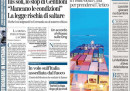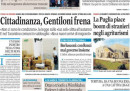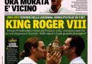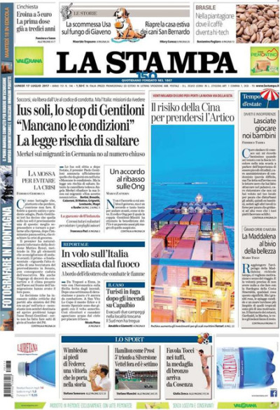 I principali quotidiani di oggi aprono tutti con l’annuncio del presidente del Consiglio Gentiloni di voler rimandare all’autunno l’esame della legge sulla cittadinanza da parte del Senato per il timore di non avere la maggioranza necessaria all’approvazione, con una scelta che fa temere ai sostenitori del provvedimento che non si riuscirà a votare definitivamente la legge prima della fine della legislatura. I quotidiani sportivi celebrano l’ottava vittoria dello svizzero Roger Federer a Wimbledon, che ha battuto nettamente il croato Marin Cilic in finale.