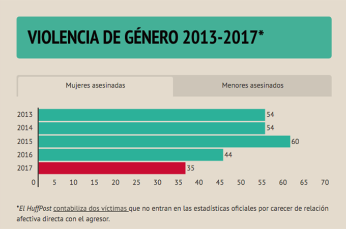 Attualmente in Spagna viene uccisa una donna ogni cinque giorni a causa della violenza domestica (in Italia una donna ogni tre giorni). Si verifica uno stupro o un’aggressione sessuale ogni otto ore. I dati ufficiali dicono che dal 2003, anno da cui vengono tenuti i conti, sono state uccise più di 780 donne. Questa cifra è però relativa, dato che attualmente la legge spagnola riconosce solo la violenza domestica esercitata dal partner o dall’ex partner della vittima. Gli omicidi che si verificano al di fuori di quest’area non rientrano nelle statistiche. Nel 2017 sono state uccise 32 donne e 6 bambini, meno di un terzo di queste donne aveva presentato una denuncia: i dati sono in aumento rispetto a quelli dello scorso anno. A causa delle violenze di genere dal gennaio del 2017 16 minori di 18 anni sono rimasti orfani.
