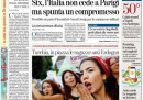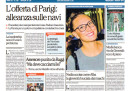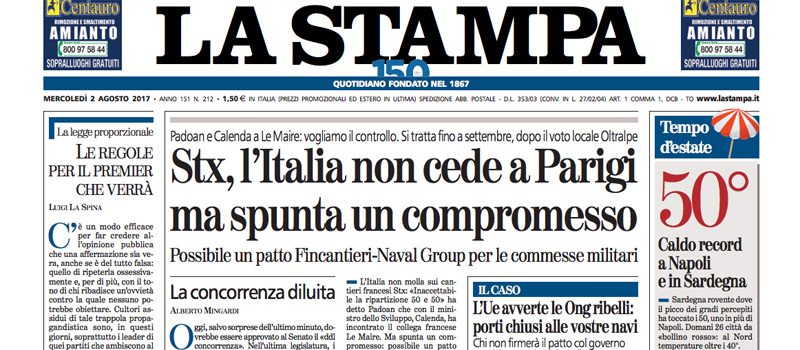 La maggior parte dei giornali di oggi titola in apertura sull’incontro di ieri fra il ministro dell’Economia francese Le Maire e quello italiano Padoan sulla nazionalizzazione dei cantieri navali di Saint-Nazaire decisa dalla Francia per bloccarne l’acquisizione da parte di Fincantieri: Padoan ha ribadito l’interesse italiano a mantenere la maggioranza della società navale, mentre Le Maire ha proposto un accordo di collaborazione sulle forniture militari. Avvenire si occupa invece dei migranti e della missione militare italiana nelle acque libiche, il Giornale, il Fatto e la Verità criticano il Parlamento per la lunga chiusura per le ferie estive, mentre il Messaggero e il Dubbio aprono sui nuovi problemi per la giunta Raggi a Roma.