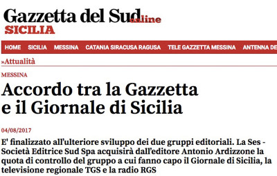 Il Giornale di Sicilia, quotidiano nazionale con sede a Palermo, e la Gazzetta del Sud, quotidiano locale che si occupa della Sicilia orientale e della Calabria, con sede a Messina, si uniranno in un unico gruppo editoriale. L’editore della Gazzetta del Sud, la Società Editrice Siciliana (SES), acquisirà la quota di maggioranza del gruppo di cui fa parte il Giornale di Sicilia: nell’operazione sono coinvolti anche i siti, le tv (Tgs, Rtp e Antenna dello Stretto) e le radio collegate alle due testate. Antonio Ardizzone, direttore del Giornale di Sicilia, che era di proprietà della sua famiglia dalla fondazione nel 1860, entrerà nel consiglio di amministrazione di SES, ne acquisirà una quota azionaria e rimarrà presidente e direttore del suo quotidiano. Il comunicato dice: