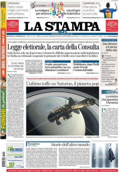 Per la maggior parte dei giornali l’apertura è dedicata alla decisione della conferenza dei capigruppo al Senato di togliere dal calendario per il mese di settembre la discussione della legge sullo Ius soli, per la mancanza di una maggioranza che possa approvare il provvedimento. La Stampa titola invece sulla legge elettorale, Avvenire commenta i dati dell’OCSE sulle università italiane, il Fatto si occupa delle cifre del nuovo contratto di Fabio Fazio con la RAI, e i quotidiani sportivi aprono sulla sconfitta della Juventus, battuta 3-0 a Barcellona nella giornata iniziale della Champions League.