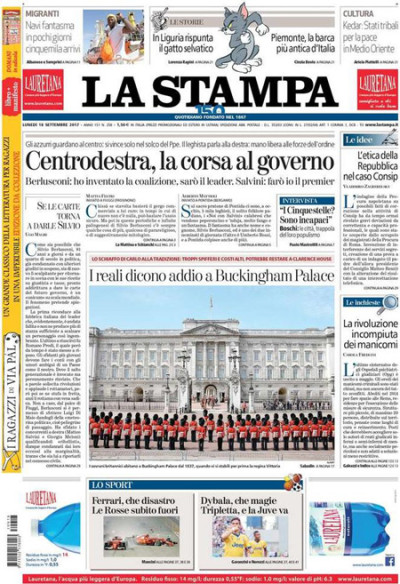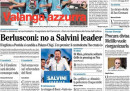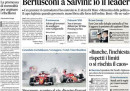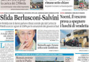 La leadership del centrodestra in vista delle prossime elezioni è l’argomento in apertura sulla maggior parte dei giornali di oggi, con Berlusconi a Fiuggi e Salvini a Pontida che nei loro discorsi rivendicano entrambi per sè il ruolo. Repubblica si occupa invece della legge sullo Ius soli, ipotizzando un accordo fra Gentiloni e il Vaticano per spingere Alfano a votarne l’approvazione, il Fatto e il Foglio seguono l’inchiesta CONSIP, mentre i giornali sportivi titolano sui risultati del campionato di calcio, con le nette vittorie di Juventus e Napoli, e sull’incidente che ha coinvolto le due Ferrari alla partenza del Gran Premio di Singapore di Formula 1.