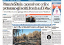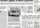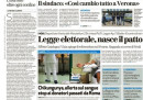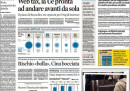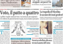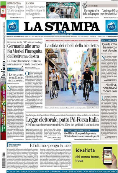 I giornali di oggi si occupano in apertura di notizie diverse: alcuni seguono le trattative fra i partiti sulla legge elettorale dopo la presentazione alla Camera di una nuova proposta da parte del Partito Democratico, sulla quale sarebbero d’accordo Forza Italia, Lega e Area Popolare. Repubblica apre invece sul voto online per le primarie del Movimento 5 Stelle e sulle difficoltà per gli iscritti per riuscire a votare ieri, la Stampa presenta le elezioni politiche di domenica in Germania, il Manifesto segue le tensioni in Spagna fra Catalogna e governo centrale per il referendum sull’autonomia, mentre il Giornale si preoccupa che il governo aumenti le tasse.