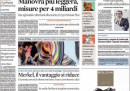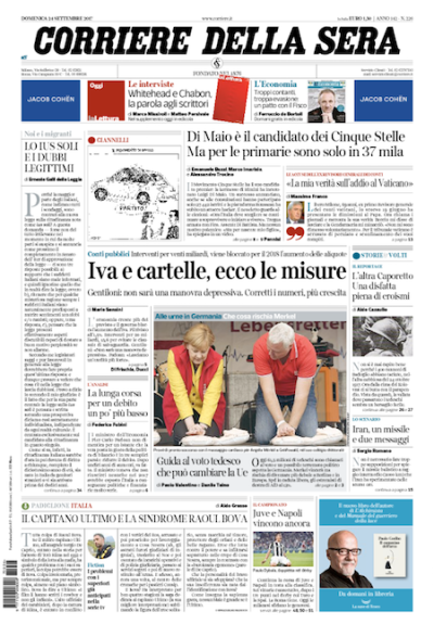 Molti dei principali quotidiani italiani scelgono di dedicare la prima pagina alla vittoria di Luigi Di Maio alle primarie del Movimento 5 Stelle, soffermandosi anche sull’affluenza alle votazioni (molto bassa, di circa un iscritto al blog su cinque). Si parla già delle elezioni politiche in Germania, in corso oggi. I giornali sportivi si occupano soprattutto della netta vittoria della Juventus nel derby, per 4-0.