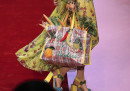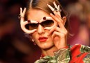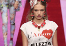 La collezione di domenica era intitolata “Regina di Cuori” ed era costruita attorno al mondo delle carte da gioco, che facevano anche da sfondo alla passerella. È stata aperta da 13 vestiti tutti col corpetto nero, ispirati a quelli indossati da Madonna e Linda Evangelista negli anni Novanta. Poi sono arrivati i soliti abiti pop: gonnellone con cipolle, pesci, piselli e cannoli siciliani, borse da cui spuntano carote e peperoncini, bottoni a forma di cavolo e occhiolani stravaganti. Il cibo è stato un tema molto presente su questi abiti disegnati per «per donne che preferiscono indossare i loro biscotti piuttosto che mangiarli», scrive il Guardian.