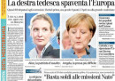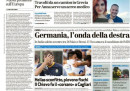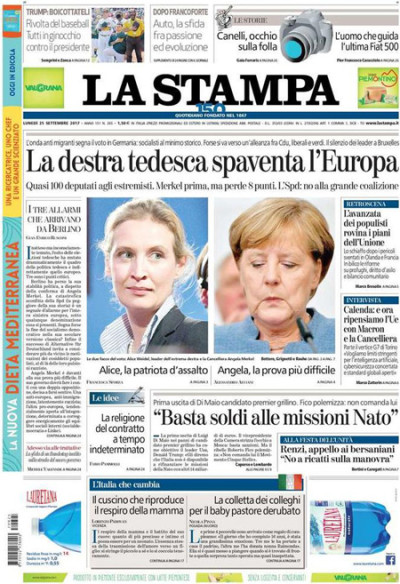 I risultati delle elezioni in Germania sono la notizia di apertura su tutti i giornali di oggi, che sottolineano il primato della CDU/CSU del cancelliere uscente Merkel, nonostante il netto calo di voti rispetto alle elezioni precedenti, e il successo del partito di estrema destra AfD che diventa il terzo partito del paese. Il Fatto segue anche oggi le vicende del Movimento 5 Stelle con le dichiarazioni di Beppe Grillo, mentre Libero critica il governo per la manovra economica che verrà varata a breve.