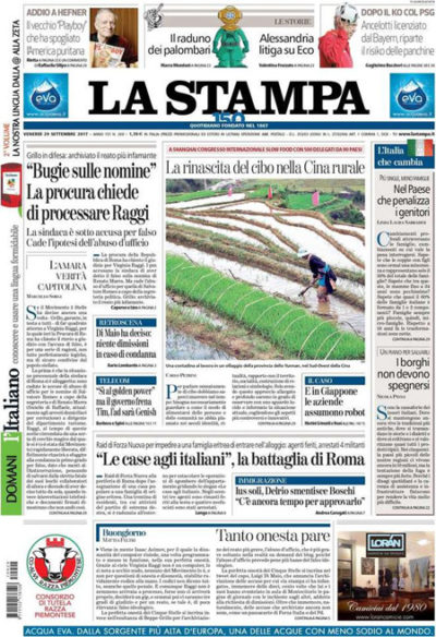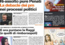 La notizia di apertura sui principali giornali di oggi è la richiesta di rinvio a giudizio per falso per il sindaco di Roma Raggi da parte della procura di Roma; a questa notizia alcuni giornali ne associano altre sempre su inchieste che riguardano la politica, con l’assoluzione dell’ex presidente della Provincia di Milano Filippo Penati e la richiesta di processo per 16 ex consiglieri regionali del Lazio del Partito Democratico. Il Manifesto apre invece sui sequestri di alcuni stabilimenti industriali in Puglia per violazione delle norme sui rifiuti pericolosi, mentre Avvenire e Libero titolano sull’apertura della conferenza sulla famiglia. I giornali sportivi si occupano della vittoria del Milan in Europa League grazie al gol segnato dal giovane attaccante Cutrone nel recupero della partita con il Rijeka e del licenziamento dell’allenatore del Bayern Ancelotti.