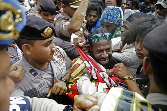 Uno scontro tra polizia e manifestanti a favore dell’indipendenza a Jakarta lo scorso dicembre (AP Photo/Dita Alangkara)
