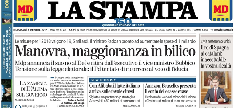 La maggior parte dei giornali di oggi dedica l’apertura alla manovra economica presentata dal ministro dell’Economia Padoan in Parlamento, con la decisione dei rappresentanti di Articolo 1 – MDP di non votare la relazione sul Documento di Economia e Finanza e le conseguenti dimissioni dal governo del viceministro dell’Interno Bubbico. Il Giornale titola invece sulle critiche della Corte dei Conti all’ipotesi di abbassare l’età pensionistica, Avvenire ricorda i morti nel naufragio di Lampedusa di quattro anni fa, e il Fatto continua la sua campagna sulla legge elettorale.