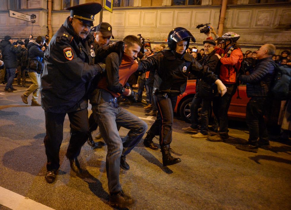 Alcuni poliziotti russi portano via un manifestante arrestato a San Pietroburgo, il 7 ottobre 2017 (OLGA MALTSEVA/AFP/Getty Images)