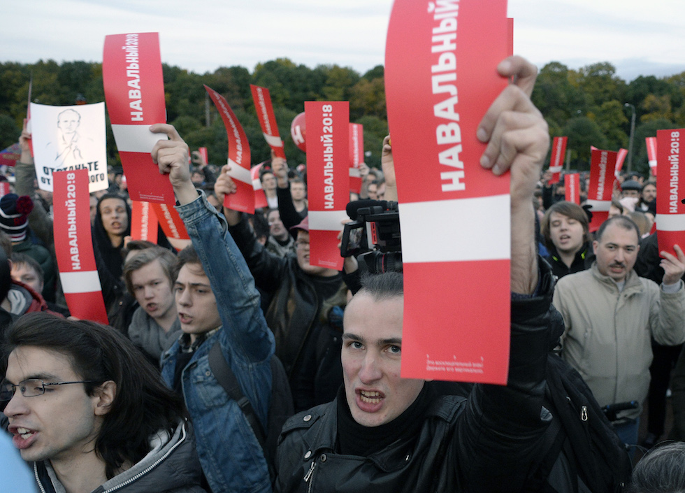 Sostenitori di Alexei Navalny nella manifestazione di San Pietroburgo, il 7 ottobre 2017; sui fogli che tengono in mano c’è scritto «Navalny 2018» (OLGA MALTSEVA/AFP/Getty Images)