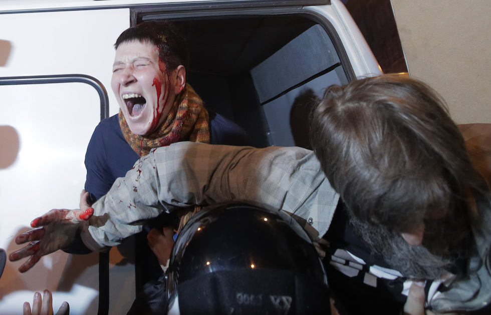 L’arresto di alcuni manifestanti a San Pietroburgo, il 7 ottobre 2017 (AP Photo/Dmitri Lovetsky)