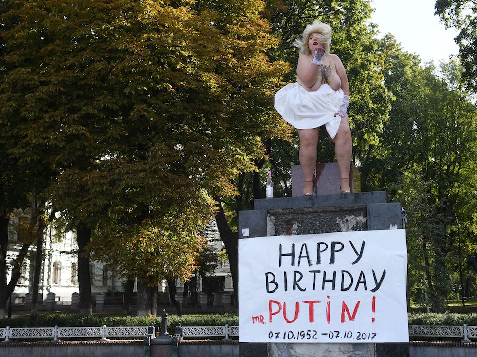 C’è stata una piccola protesta contro Putin anche a Kiev, in Ucraina: un’attivista del gruppo femminista FEMEN si è travestita da Marilyn Monroe – ma a seno scoperto, come in tutte le proteste del gruppo – e ha cantato la famosa “Happy Birthday, Mr. President”, che l’attrice americana cantò a una festa di compleanno di John Fitzgerald Kennedy.