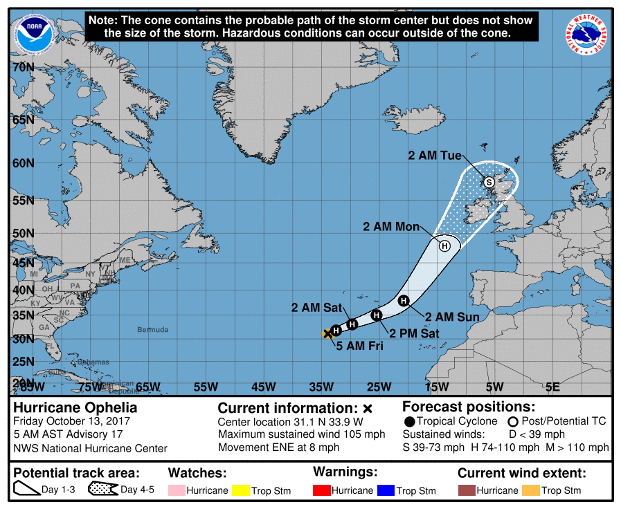 Il percorso seguito finora da Ophelia è comunque insolito, ma era già successo qualcosa di simile. Nel 2006, per esempio, l’uragano Gordon portò venti forti e molta pioggia nella parte occidentale del Regno Unito, anche se ormai era stato declassato a tempesta. Al momento il rischio più alto è per l’Irlanda, che potrebbe essere interessata da forti piogge e venti intensi a partire da lunedì, quando Ophelia dovrebbe essere diventato una tempesta extratropicale. L’uragano sta infatti perdendo potenza man mano che si sposta verso nord e incontra acque più fredde, che per via della minore evaporazione alimentano meno il ciclo che porta alla produzione del grande sistema nuvoloso.