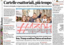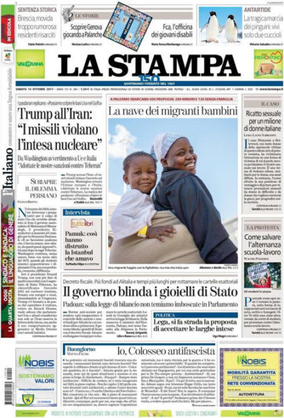 Ci sono notizie diverse in apertura sui principali giornali di oggi: alcuni titolano sulla decisione del presidente degli Stati Uniti Trump di non certificare l’accordo sul nucleare con l’Iran e di affidare al Congresso la decisione di applicare nuove sanzioni, altri si occupano del decreto fiscale approvato dal governo che prolunga la possibilità di chiedere la rateazione delle cartelle esattoriali. Repubblica intervista il segretario del Partito Democratico Renzi, Libero e il Manifesto aprono sulle manifestazioni di protesta degli studenti contro l’alternanza scuola-lavoro, il Fatto critica anche oggi la legge elettorale votata giovedì dalla Camera, e il Messaggero segue la vicenda della vendita di Alitalia, per la quale è stata spostata la scadenza per le proposte di acquisto, mentre i giornali sportivi presentano la giornata di campionato che torna dopo la pausa per le nazionali.