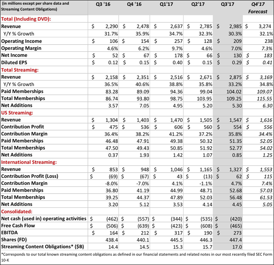 Nel suo ultimo trimestre, Netflix ha superato le proprie aspettative per quanto riguarda la crescita degli iscritti: aveva previsto di aggiungerne circa 4,4 milioni, invece le iscrizioni a livello globale sono aumentate di 5,3 milioni (850mila negli Stati Uniti, i restanti in giro per il mondo); in totale gli iscritti sono ora 109 milioni. L’azienda ha prodotto 2,99 miliardi di ricavi e ha annunciato che aumenterà gli investimenti nel prossimo anno per quanto riguarda le sue produzioni originali, arrivando a spendere circa 8 miliardi di dollari, un miliardo in più di quanto inizialmente programmato. Il budget sarà utilizzato per la produzione di 30 nuove serie animate e di 80 film originali, insieme a diverse altre serie televisive.