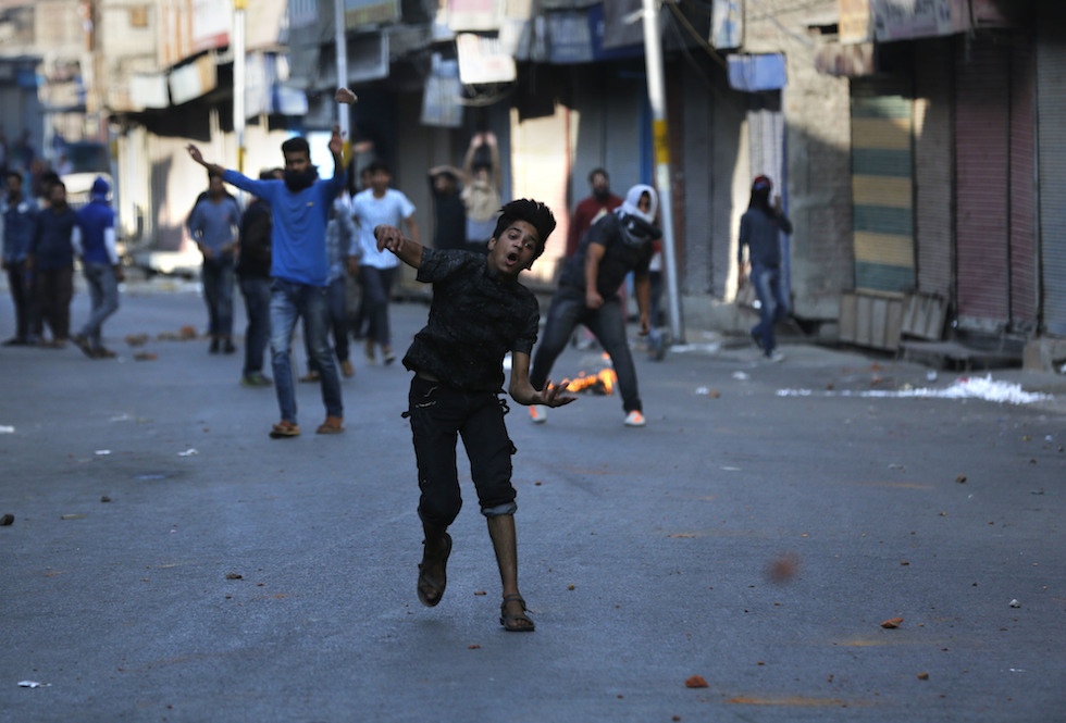 Un ragazzino del Kashmir tira delle pietre contro alcuni poliziotti indiani durante uno scontro a Srinagar,il 16 ottobre 2017: gli scontri sono avvenuti durante una manifestazione di protesta contro gli attacchi alle trecce (AP Photo/Mukhtar Khan)