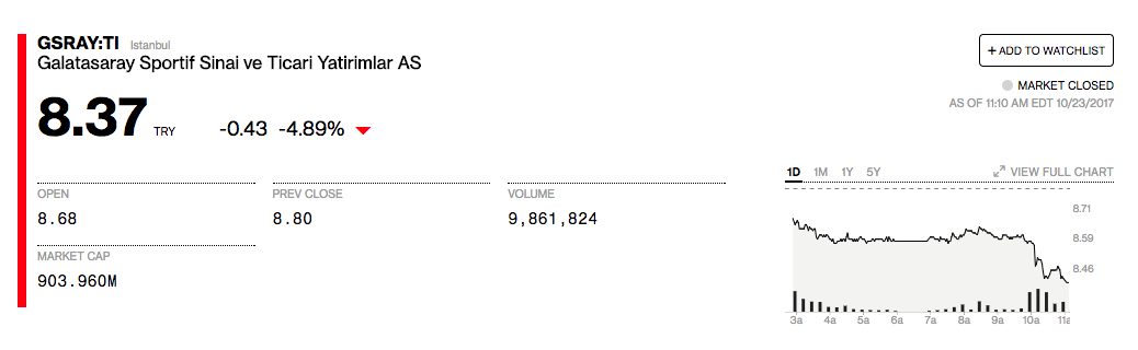 La notizia dell’indagine governativa ha fatto scendere di colpo il titolo del Galatasaray alla Borsa di Istanbul, ha scritto Bloomberg in un articolo dei suoi corrispondenti in Turchia. In una sola giornata il titolo ha perso quasi il cinque per cento, nonostante la squadra sia in testa al campionato turco e abbia mantenuto la propria posizione pareggiando 0-0 il derby contro il Fenerbahce. Il valore delle azioni è sceso da 8.68 (era 8.80 il giorno prima) a 8.37 lire turche.