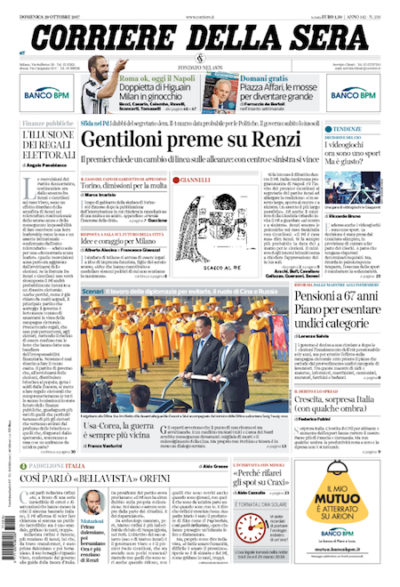 Le prime pagine dei principali quotidiani sono occupate perlopiù da due notizie: l’assemblea programmatica del PD a Napoli, a cui hanno partecipato sia Matteo Renzi sia Paolo Gentiloni, e le dimissioni del capo di gabinetto del sindaco di Torino per una richiesta poco opportuna al presidente dell’azienda dei trasporti della città. Nei boxini compaiono alcuni aggiornamenti dalla Catalogna. I giornali sportivi si occupano soprattutto della vittoria della Juventus per 2-0 in casa del Milan.