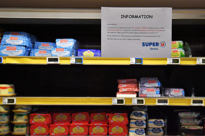 Della carenza di burro in Francia si parla da settimane. Hanno cominciato a circolare articoli in cui si spiega quali alternative trovare al burro o come produrselo da soli, in casa. Ci si chiede se per Natale ce ne sarà abbastanza, il ministro dell’Agricoltura ha affrontato la questione in Parlamento, circolano online immagini di scaffali vuoti con l’hashtag #BeurreGate e c’è chi si è messo a vendere (per scherzo) i propri resti di burro in alcuni siti.
