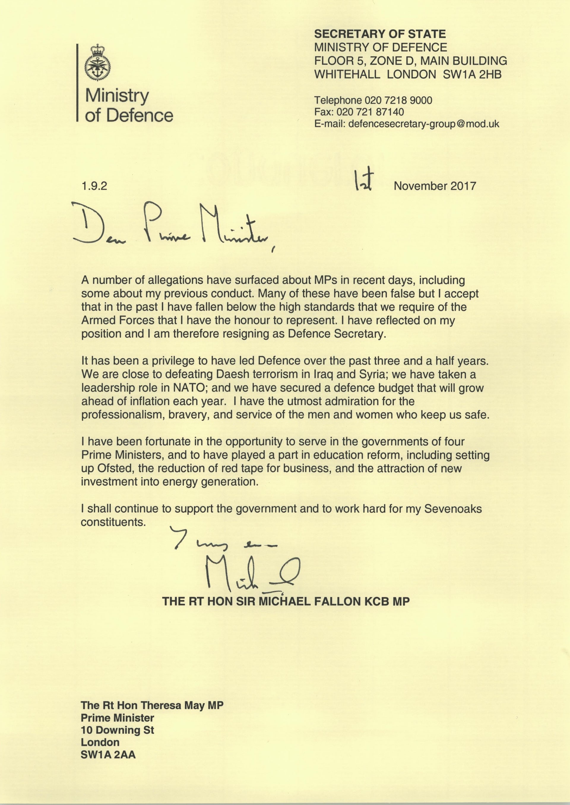 Nella sua lettera di dimissioni a May, Fallon ha detto che molte delle accuse che sono state fatte nei suoi confronti negli ultimi giorni sono false, ma che altre lo hanno fatto riflettere sui suoi comportamenti sbagliati. Fallon ha scritto di essere arrivato alla conclusione che alcuni suoi comportamenti sono stati al di sotto dello standard richiesto per rappresentare le forze armate, come imponeva il suo ruolo.
