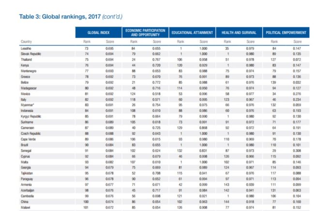 Lo scorso 2 novembre il World Economic Forum, la fondazione che organizza il Forum di Davos in Svizzera, ha pubblicato il rapporto “The Global Gender Gap Report 2017“, in cui ogni anno vengono misurati il livello di diseguaglianza di genere in settori come lavoro, politica, salute e istruzione. Il dato più preoccupante nel rapporto è che l’Italia figura nella classifica generale all’82° posto su 144 nazioni; dieci anni fa, quando nel 2006 venne pubblicato il primo report, l’Italia era al 77°. Nella classifica generale l’Italia è dietro paesi come lo Zimbabwe, El Salvador e il Vietnam. Va ancora peggio nella classifica sulle opportunità economiche lavorative: dieci anni fa l’Italia era all’87° posto, mentre oggi è al 118°. In questa classifica l’Italia è, come punteggio, più vicina all’Arabia Saudita (uno degli ultimi al 140° posto) che alla Germania (43°).